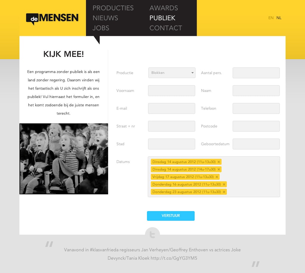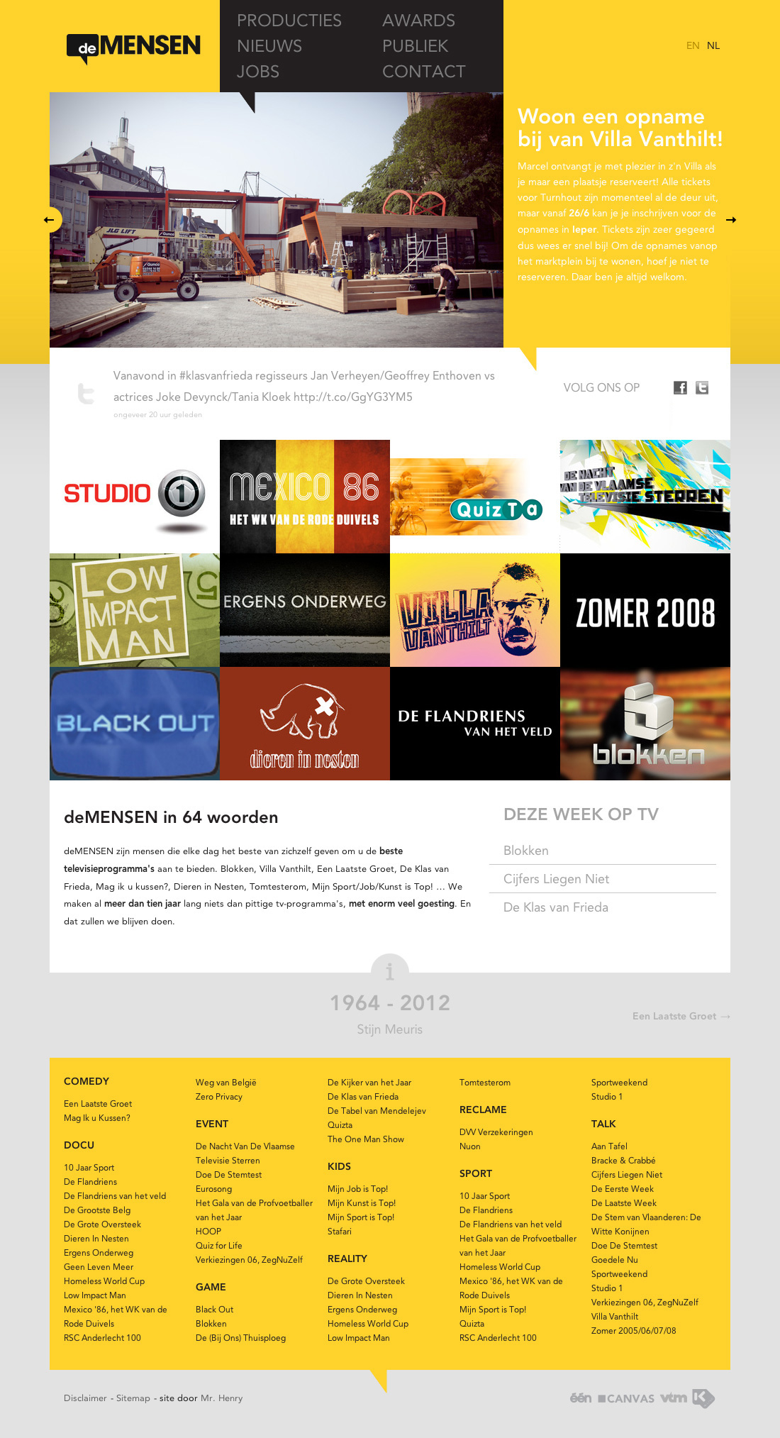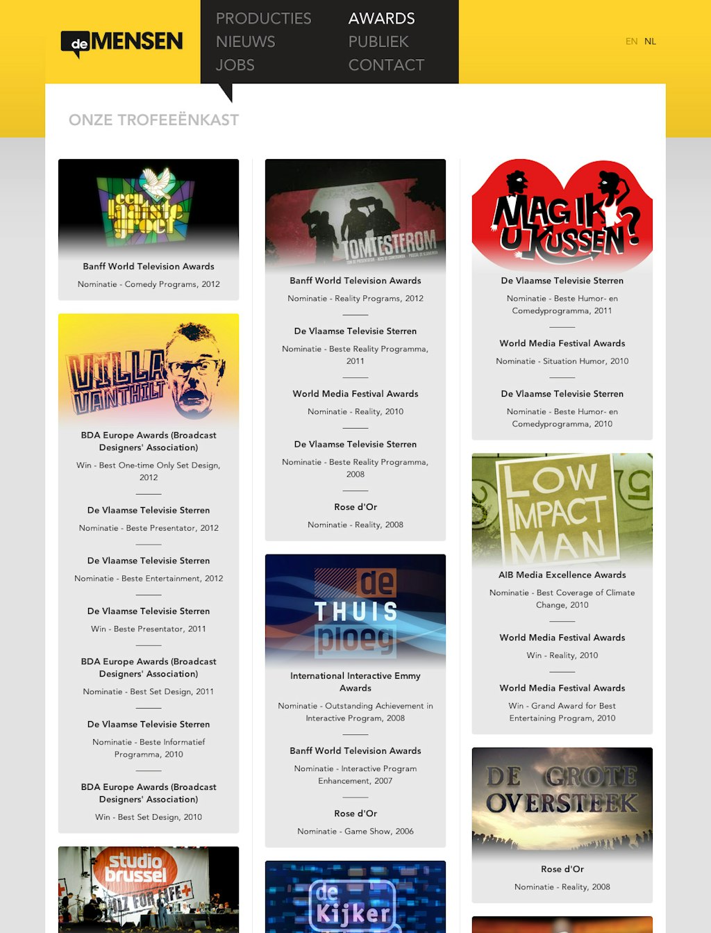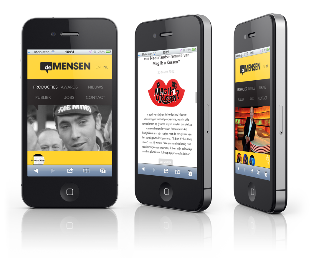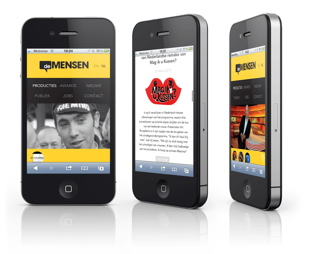 Goodie!! deMENSEN is a first-class belgian production house. They make a-lot of television! We were asked by them to create a solid, online experience, to show their work in all their glory. So this yellow baby came out! It runs side-by-side with it's responsive version for all the mobile adepts out there. Take a look, and find all the little details...