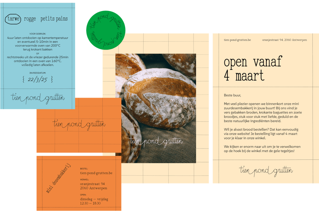 At tien pond grutten, craft is a family affair. The bakery’s visual identity began with a personal sketch by owner Carmen, later refined by her father and illustrator, Serge. Building on this personal touch, we developed a visual identity inspired by the bakery’s sun-washed yellow brick façade, reimagined as a hand-drawn checkered pattern. This motif echoes the craft, care, and repetition of the baking process.